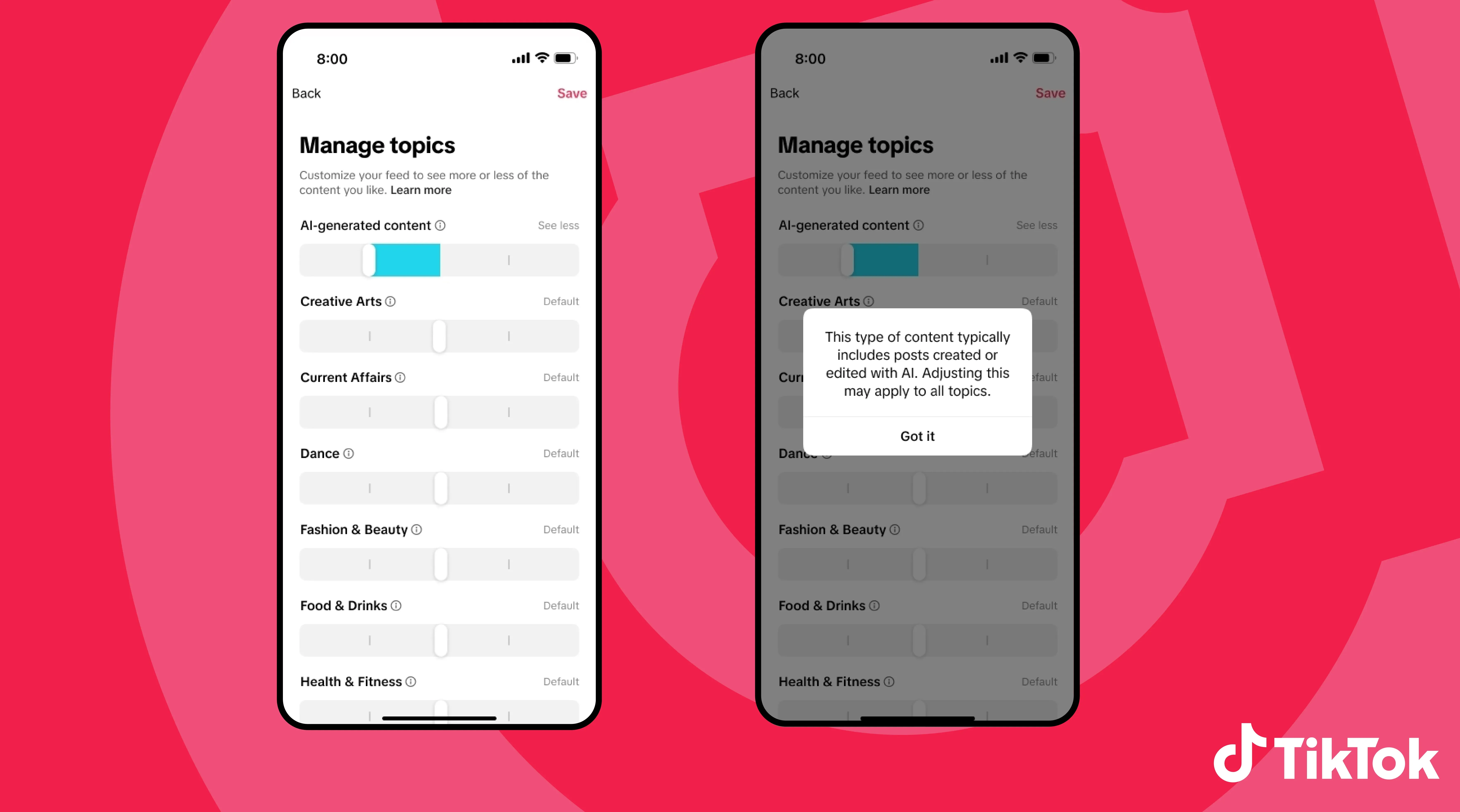 تیکتاک که زمانی فقط محلی برای محتوای تولیدشده توسط کاربران بود، اکنون امکانی جدید ارائه داده که به کاربران اجازه میدهد میزان محتوای تولیدشده با هوش مصنوعی (AIGC) را در بخش «For You» خود تنظیم کنند. این شرکت همچنین فناوریهای پیشرفتهتری را برای برچسبگذاری محتواهای تولیدشده توسط هوش مصنوعی به کار گرفته است.